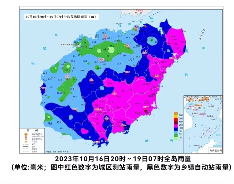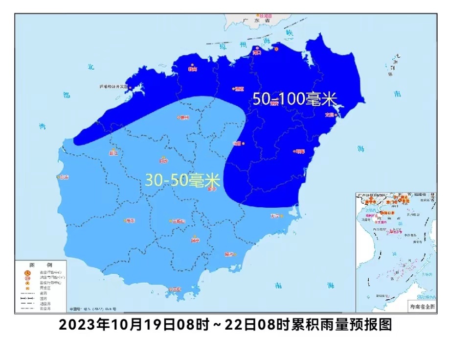 陆地方面:19日,西部、南部和东北部地区有大到暴雨,其余地区有中到大雨;20日~21日,东部和西部地区有大到暴雨,其余地区有小到中雨。各地累积雨量(10月19日08时~22日08时):海口、文昌、琼海、澄迈、定安、临高和儋州等市县50~100毫米,其余市县30~50毫米。