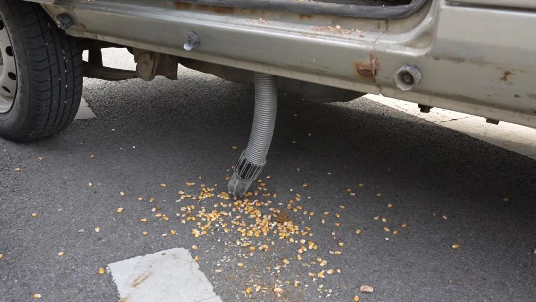 据报案群众称,当日一辆破旧的面包车从自家晾晒在路边的玉米上方驶过去,他见车辆经过的地方玉米似乎少了些,便仔细瞅了一眼,发现面包车的下方竟然露出一根管子在吸取路面上的玉米粒。