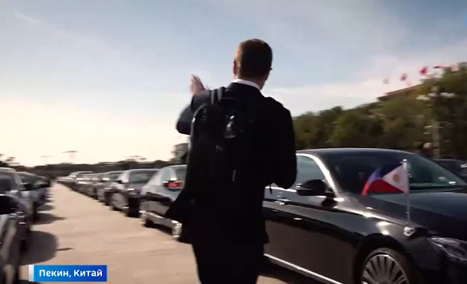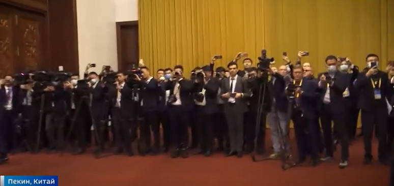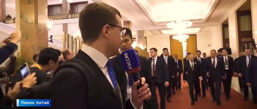 【环球网报道】10月18日,国家主席习近平在人民大会堂同来华出席第三届“一带一路”国际合作高峰论坛的俄罗斯总统普京举行会谈。“俄罗斯1”电视台记者帕维尔·扎鲁宾当天在社交平台Telegram上分享一段视频,展示普京与俄代表团其他成员进入会谈大厅时现场记者的报道情况。