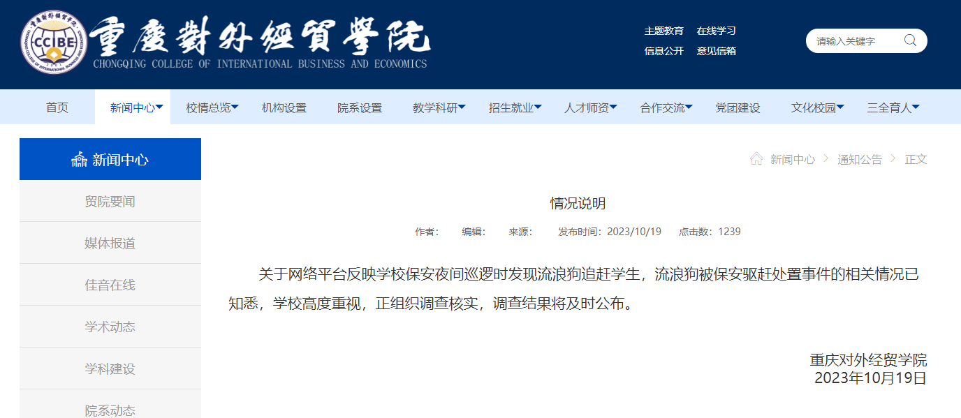 关于网络平台反映学校保安夜间巡逻时发现流浪狗追赶学生,流浪狗被保安驱赶处置事件的相关情况已知悉,学校高度重视,正组织调查核实,调查结果将及时公布。