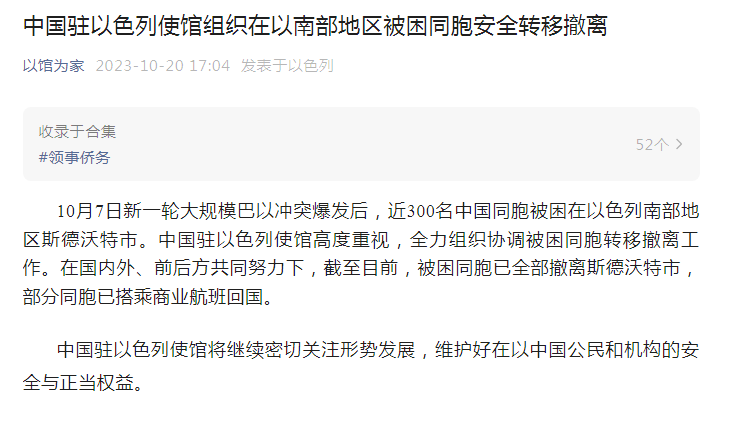 10月7日新一轮大规模巴以冲突爆发后,近300名中国同胞被困在以色列南部地区斯德沃特市。中国驻以色列使馆高度重视,全力组织协调被困同胞转移撤离工作。在国内外、前后方共同努力下,截至目前,被困同胞已全部撤离斯德沃特市,部分同胞已搭乘商业航班回国。