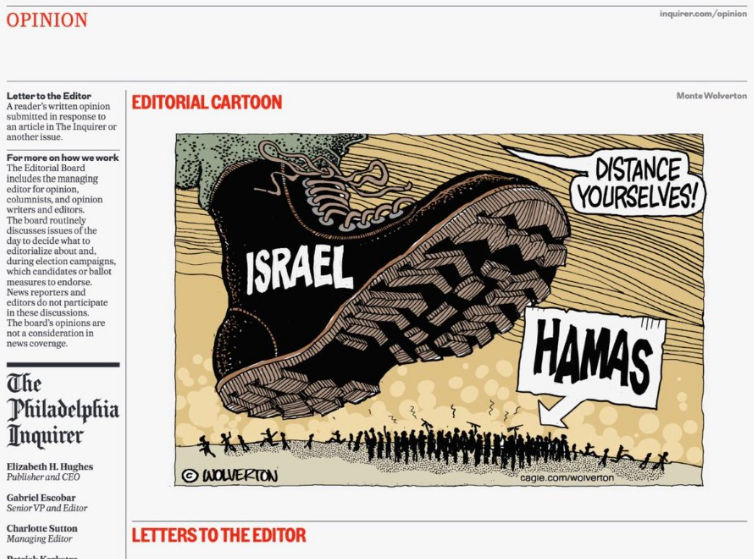 报道称,这幅漫画在社交媒体上引发抨击,亲以色列人士指责该讽刺画是“反犹太的”。在争议声中,《费城问询报》编辑部在一份声明中道歉称,“显然,这幅漫画非常不敏感,尤其是在当前反犹太主义抬头这种时候。我们听到了人们的强烈抗议,并对它造成的痛苦道歉。”此外,在该媒体的一篇文章中,《费城问询报》高层谴责了哈马斯对以色列的袭击,并明确表示认为以色列“有权自卫”,承诺将更好地审查该媒体的漫画,以“防止类似错误再次发生”。