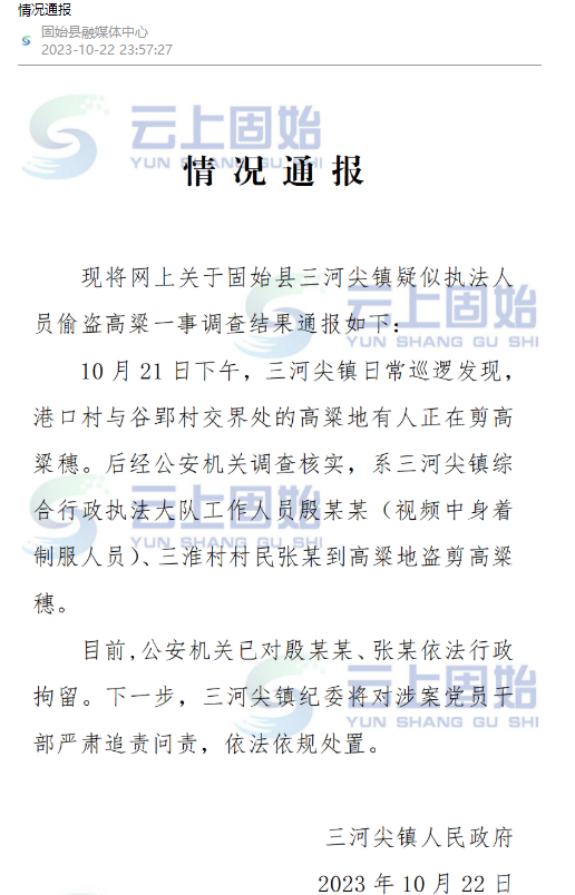 10月22日晚,河南省信阳市固始县三河尖镇通报“疑似有执法人员带人偷红高粱”,全文如下: