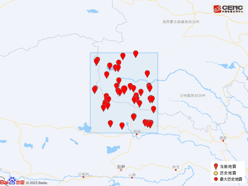 历史地震: 根据中国地震台网速报目录,震中周边200公里内近5年来发生3级以上地震共91次,最大地震是2021年3月19日在西藏那曲市比如县发生的6.1级地震(距离本次震中226公里),按震级大小前50次历史地震分布如图。