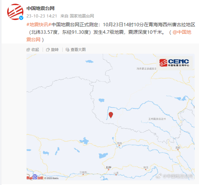 青海海西州唐古拉地区发生4.7级地震,震源深度10千米