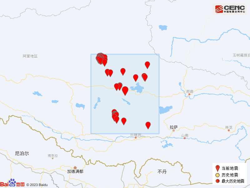历史地震: 根据中国地震台网速报目录,震中周边200公里内近5年来发生3级以上地震共47次,最大地震是2020年7月23日在西藏那曲市尼玛县发生的6.6级地震(距离本次震中232公里),历史地震分布如图。