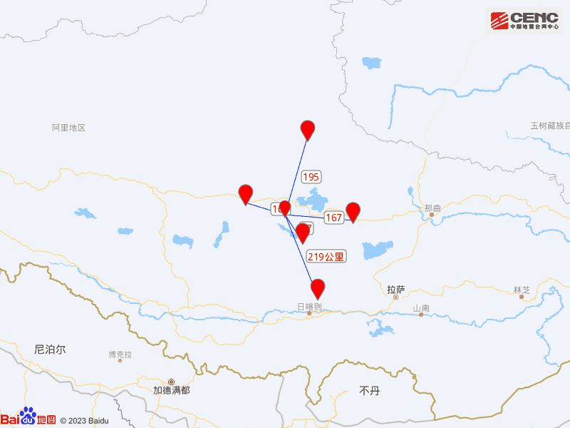 周边县城: 震中距申扎县77公里、距尼玛县102公里、距班戈县167公里、距双湖县195公里、距南木林县219公里,距日喀则市257公里,距拉萨市343公里。