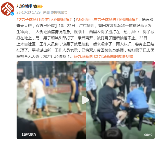 10月22日,广东深圳。有网友发视频称一篮球场两人发生冲突,一人倒地抽搐情况危急。视频中,两黑衣男子扭打在一起,其中一男子被打在地上,另一男子朝其头部打了一拳后离开,被打男子随后抽搐不止。23日,上木古社区一工作人员称,该男子就是抽筋,后来没事了,两人认识,警务室已经处理了。平湖派出所一工作人员表示,已将双方带回警务室处理,被打男子已去医院检查无大碍,双方已经协商了。