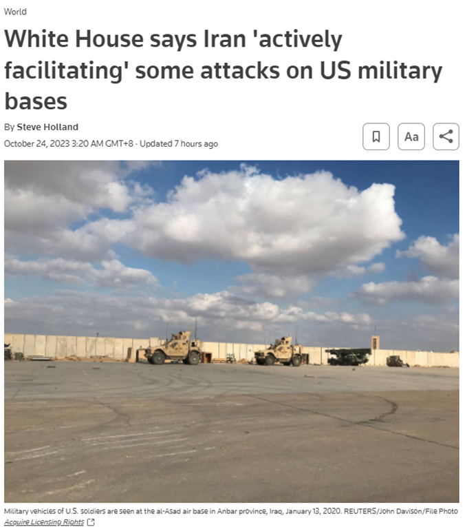 路透社23日报道说,美国国家安全委员会战略沟通协调员柯比当天称,对驻扎在中东地区的美军的袭击在过去一周,尤其是在过去几天有所增加,美国认为发动袭击的相关组织得到伊朗伊斯兰革命卫队和伊朗政府的支持,伊朗同样支持巴勒斯坦伊斯兰抵抗运动(哈马斯)和黎巴嫩真主党。