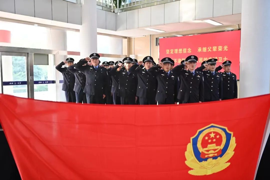 “是父亲亦是战友,今天我将重启警号062671,在此向局党委郑重承诺,我将视062671警号为终身荣誉,继承父亲遗志,以父亲为榜样,坚定接过父亲手中的旗帜,铭记嘱托,扛起责任,献身崇高的人民公安事业!”满怀着对父亲的崇敬与缅怀,张驰进行了发言。随后,迎着警旗,领誓了公安机关人民警察誓词,带领着全体新警集体宣誓。