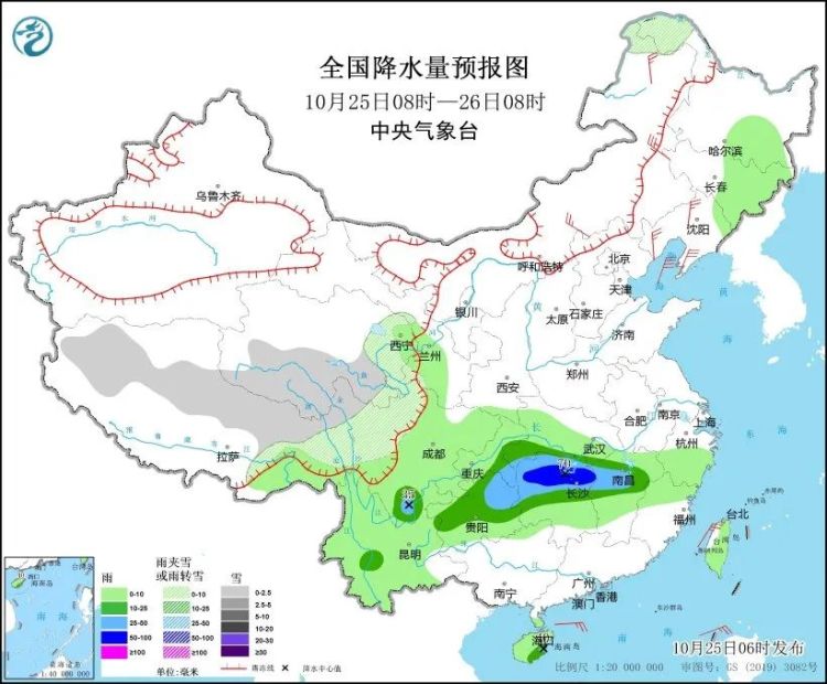 10月25日08时至26日08时,西藏北部和东部、青海东部和南部、川西高原北部等地部分地区有小雪或雨夹雪。重庆东南部、贵州中北部、湖北南部、湖南中北部、江西中部、四川南部、云南西部、海南岛东南部等地部分地区有中到大雨,其中,湖南北部等地部分地区有暴雨(50~70毫米)。内蒙古中东部、辽宁北部和西部、辽东半岛等地部分地区有4~6级风(见图1)。