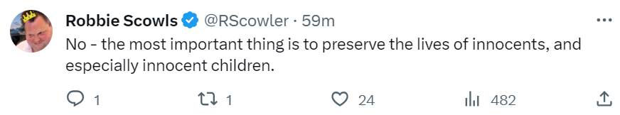 苏纳克的回应在社交媒体X引发热议,不少网友表达不同意见,不赞同苏纳克的言论。有网友直言:“不——最重要的事情是保护无辜者的生命,尤其是无辜的儿童。”↓