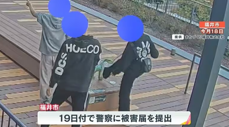 福井县有着日本最大的恐龙化石挖掘现场,当地被称为“恐龙王国”。10月18日傍晚5时,3个小孩出现在福井县福井市观光交流中心一处恐龙雕塑附近,用力踢了雕塑数次,还有人伸手剧烈摇晃雕塑。视频画面可见,小孩踢过后碎片飞溅。3人做了坏事后,翻越围栏走了。