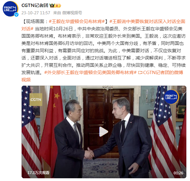 当地时间10月26日,中共中央政治局委员、外交部长王毅在华盛顿会见美国国务卿布林肯。布林肯表示,非常欢迎王毅外长来到美国。王毅说,这次应邀访美是对布林肯国务卿6月访华的回访。中美两个大国有分歧,有矛盾,同时两国也有重要共同利益,有需要共同应对的挑战。为此,中美需要对话,不仅应恢复对话,还要深入对话,全面对话,通过对话增进相互了解,减少误解误判,不断寻求扩大共识,开展互利合作。推动两国关系止跌企稳,尽快回到健康、稳定、可持续发展轨道。