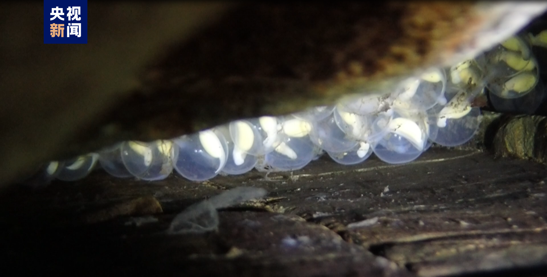 工作人员在夜间巡查时发现一处水面上漂浮着白色串珠状物体,经过仔细辨认,这几枚指甲盖大小的球体是野生大鲵的鱼卵,专家研判,在石头缝隙的深处还藏着野生大鲵的繁殖场所。