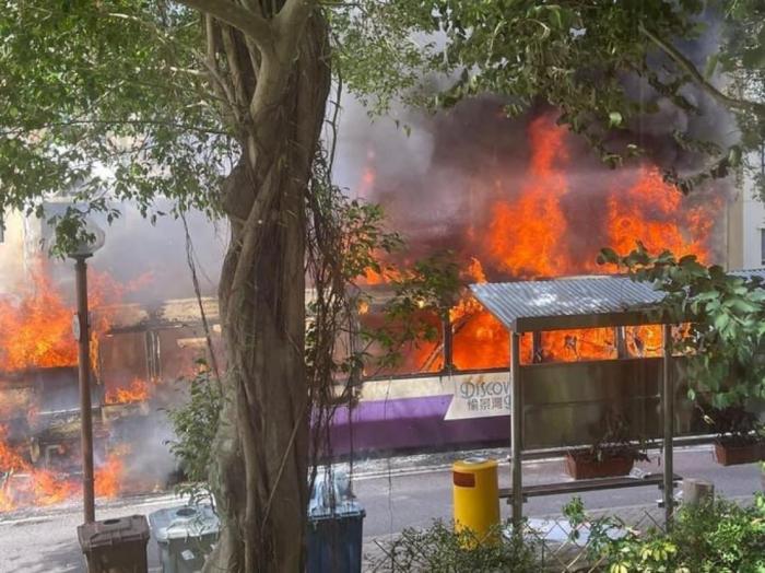 香港警方、消防局接获消息随即抵达现场开展行动,迅速灭火,现场巴士燃烧殆尽,只剩车架。