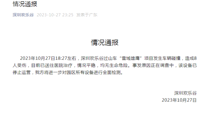 2023年10月27日18:27左右,深圳欢乐谷过山车“雪域雄鹰”项目发生车辆碰撞,造成8人受伤,目前已送往医院治疗,情况平稳,均无生命危险。事发原因正在调查中,该设备已停止运营,我方将进一步对园区所有设备进行全面检测。
