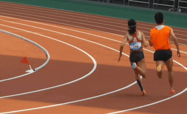 视障运动员和领跑员之间,只靠一根10厘米长的牵引绳相连。一个负责勇敢地向前跑,方向、节奏等等全部交给领跑员来把握。