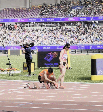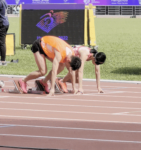 陈圣明引导刘翠青在跑道起步器前下蹲,将双脚的脚后跟置于脚蹬上,然后双手搭在她身后平视前方,确认位置不偏不倚。
