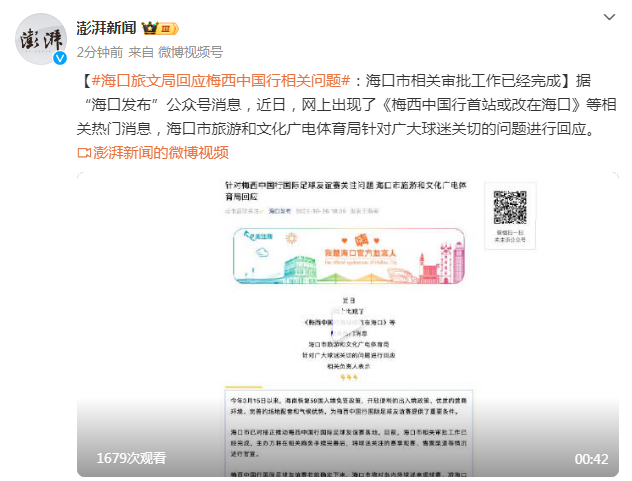 海口旅文局回应梅西中国行相关问题:海口市相关审批工作已经完成