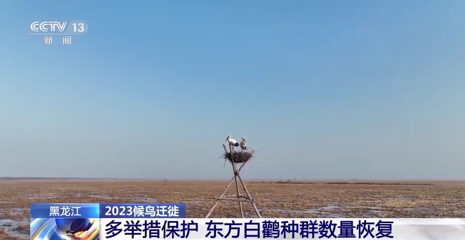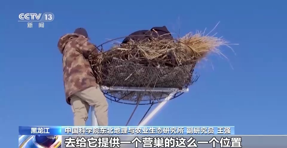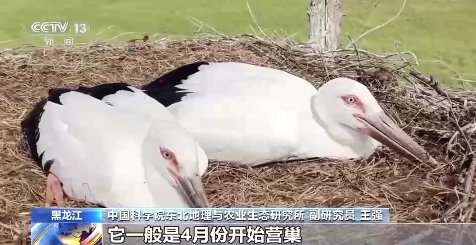 中国科学院东北地理与农业生态研究所副研究员 王强:东方白鹳的繁殖需要一个关键的生境要素,就是它在树上营巢,尤其喜欢三江平原的岛状林湿地。我们当地,包括保护区通过架设人工巢的方式,给它提供一个营巢的位置,这个效果还是很好的。