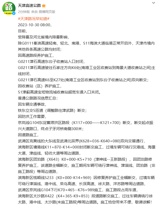 据@天津高速公路 消息,2023-10-30 08:00,目前,受降雾及河北省境内降雾影响,除G0111秦滨高速轻南、轻北、南港,S11海滨大道临港正常开启外,天津市境内其他各条高速公路均封闭。