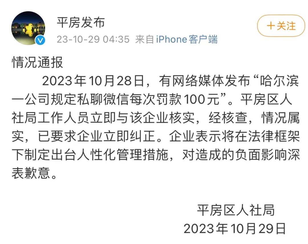2023年10月28日,有网络媒体发布“哈尔滨一公司规定私聊微信每次罚款100元”。