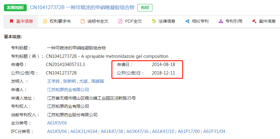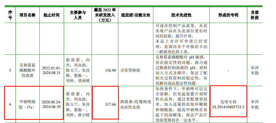 与此类似的还有,甲硝唑凝胶(1%)项目研发起止时间是2020.08.24-2024.06.30,截至2022年末投入了317.66万元研发费,形成了发明专利ZL201410405733.3。但公开资料显示,上述专利为2014年8月申请,2018年12月11日已经公开(公告),并非2020.08.24-2024.06.30期间形成的专利;而该专利发明人王学政、张新明、尤斌、周越强也并非招股书披露的项目要参与人员。