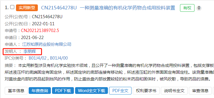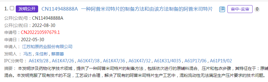 其中阿普米司特片项目投入1955.41万元,主要参与人员王学政、冯杰、刘永波、陈玉兰、朱佳彬、蔡振一、陈尧、吕鹤涛,形成专利两项,分别是实用新型CN202121389702.5发明专利CN202210597679.1。但据公开资料显示,实用新型CN202121389702.5专利发明人是李朋辉,CN202210597679.1发明人之一蔡蓓蕾,两人均不是招股书披露的项目的主要参与人员。