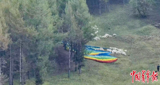 一眼望去,山坡上森林中央的草丛呈现一片“海洋”,“海洋”由高低不一的木桩制成,上有绿、黄、白、红、蓝等多种颜色,微风吹过,树木摇曳,蜿蜒曲折的木桩呈现“动态”。这个名为《层林叠浪》的作品是孔繁迪与9位村民在山坡上耗时20天完成的。“我希望用七彩的海浪预示西口村的村民们能够过上五彩斑斓的生活。”孔繁迪告诉中青报·中青网记者。