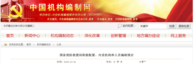 中国机构编制网10月31日发布《国家消防救援局职能配置、内设机构和人员编制规定》: