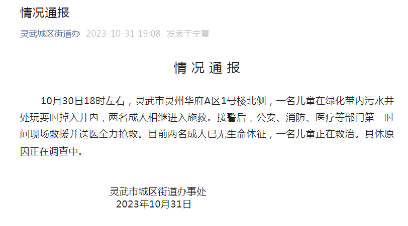 10月30日18时左右,灵武市灵州华府A区1号楼北侧,一名儿童在绿化带内污水井处玩耍时掉入井内,两名成人相继进入施救。接警后,公安、消防、医疗等部门第一时间现场救援并送医全力抢救。目前两名成人已无生命体征,一名儿童正在救治。 具体原因正在调查中。