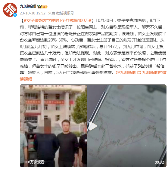10月30日,据平安青城消息,8月下旬,呼和浩特的苗女士结识了一位陌生网友,对方自称是现役军人。聊天不久后,对方称自己有一位退役的老班长正在做农副产品的期货,很赚钱,苗女士发现该平台收益率能达到20%-30%。心动后,苗女士注册了自己的账号开始投资理财。从8月底至九月初,苗女士陆续转了多笔款项,总计447万。到九月中旬,苗女士投资收益已到达几十万元,但却无法提现。对此,对方表示是因平台故障,之后便慢慢消失了。直到这时,苗女士才发现自己被骗。报警后,警方对账号挨个进行止付冻结,但苗女士的钱早已被转出。民警随后奔赴三省多地,抓获了5名涉嫌“帮信罪”嫌疑人,目前,5人已全部被采取刑事强制措施。