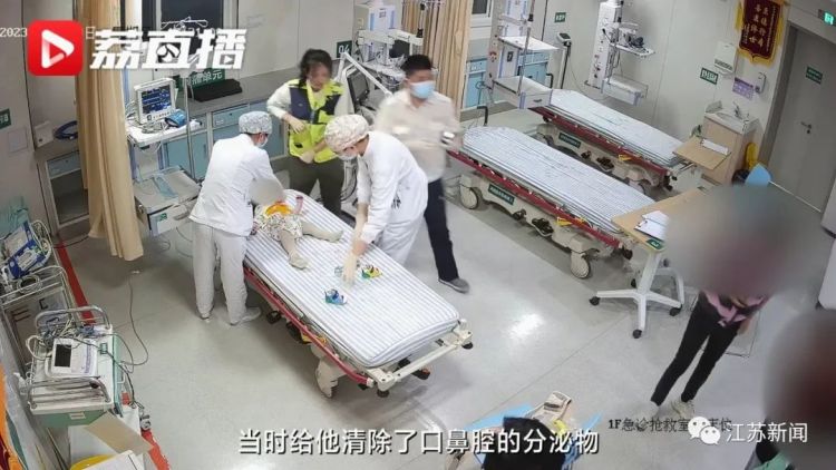 “当时给他清除了口鼻腔的分泌物,然后用了呼吸面罩给他吸氧,监测他的生命体征,发现生命体征平稳,小孩哭了,一哭,呼吸道堵塞可能就解除了。”南京市第一医院急诊科护士高久玉说。