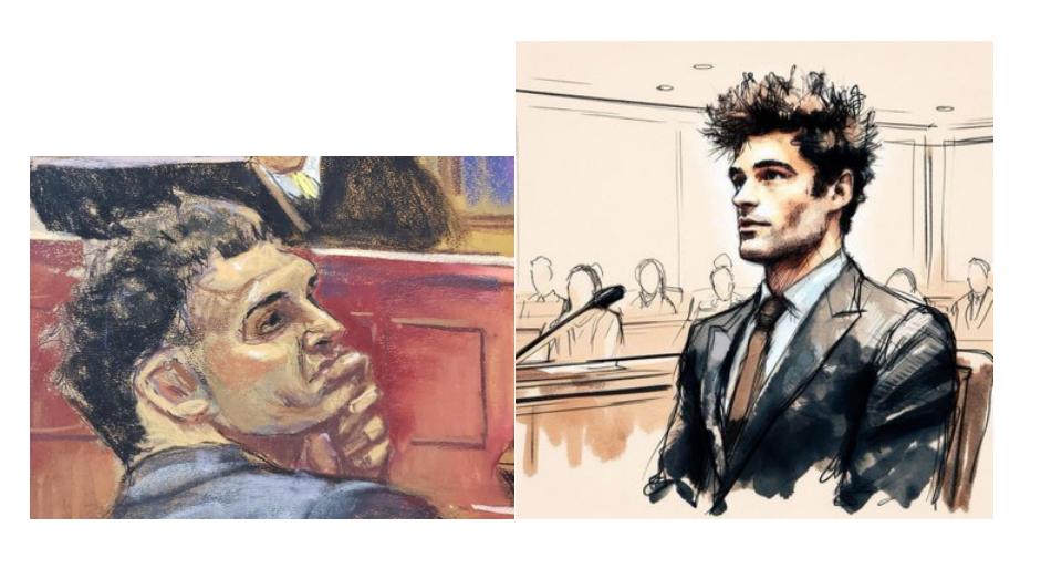 报道称,该法庭素描师简·罗森伯格受雇于路透社,此前曾为多位“明星”绘制肖像,包括橄榄球球星汤姆·布雷迪和前不久受审的前加密货币大亨萨姆·班克曼-弗里德。后者正因网上流传的法庭肖像而广受关注。在其肖像中,班克曼-弗里德拥有与其本人不符的锐利的下巴轮廓、高颧骨和凌乱得恰到好处的头发,如同高端香水广告中的明星。