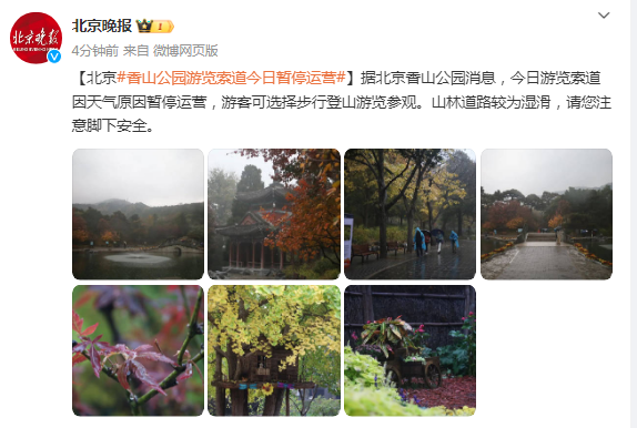 据北京香山公园消息,今日游览索道因天气原因暂停运营,游客可选择步行登山游览参观。山林道路较为湿滑,请您注意脚下安全。