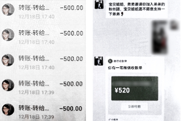 经了解:从2022年2月开始,张阿姨就在群里不断给一个叫“靳东”的用户充值打赏,不久后“靳东”就以谈恋爱的名义加上了张阿姨的微信 。张先生提供的聊天记录中能找到许多“老婆”“我会娶你”“我想你了” 等字眼。而张阿姨也在“偶像”一声声甜蜜的“宝贝”中逐渐沦陷,以至于到案发,张阿姨仍不相信网络上那个温柔体贴的帅气男星会是儿子口中的“诈骗犯”……