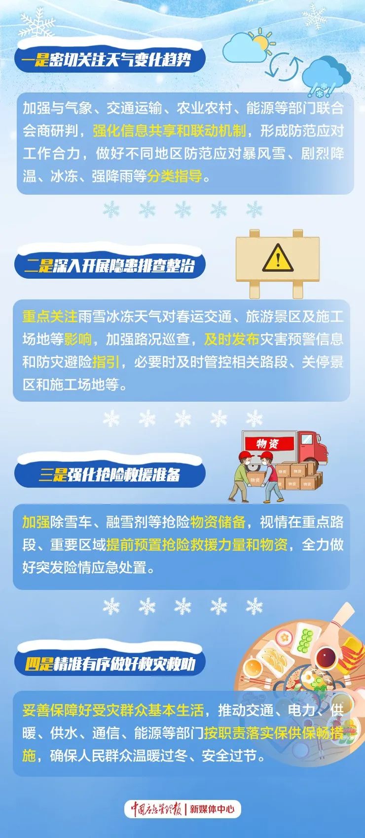 11月5日,应急管理部与中国气象局开展联合会商,视频调度内蒙古、辽宁、吉林、黑龙江等省区,研判低温雨雪冰冻发展态势,安排部署防范应对工作,并对东北地区相关省份应急管理厅发出工作提示函。会商强调,本轮大范围寒潮过程,强降雪、冻雨和降雨过程交织,雨雪相态复杂,防范难度大。会商要求,受影响地区各级各相关部门要高度重视,克服麻痹思想,迅速组织动员,各级各类责任人立即上岗到位,做到早安排、早部署;要紧盯交通、电力、通讯、农业农村等重点民生和社会经济运行领域,强化协调联动,全力做好水电气暖保供和交通保畅等工作;要在重点区域和重要场所提前预置抢险救援力量、物资和装备,及时扫雪除冰、采取交通管控等措施,严防人员伤亡和重大损失,维护各地生产生活稳定。