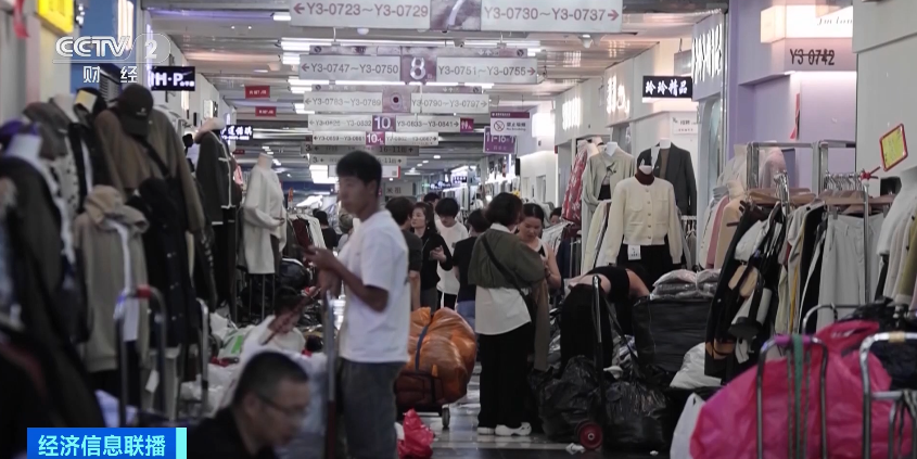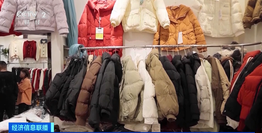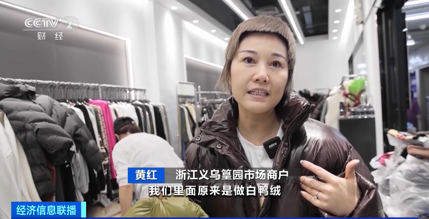 在浙江义乌的篁园服装市场,采购商钟女士正在挑选羽绒服,她告诉记者,虽然天气还不是很冷,但自己店里的羽绒服已经上新预热,销量也在增长,所以每隔一段时间,她都会来这里挑选一些新款。