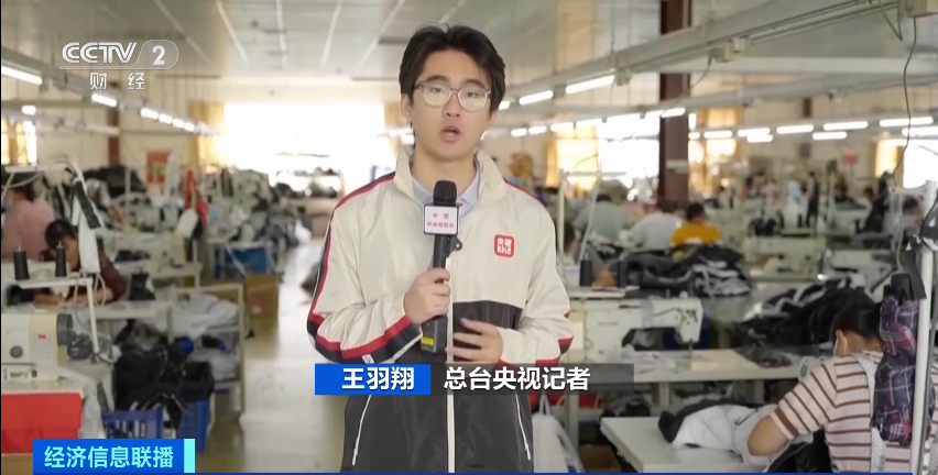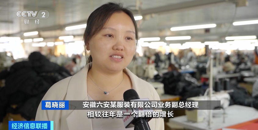 总台央视记者 王羽翔 :在安徽省六安市的一条羽绒服生产线,负责人表示,今年羽绒服的订单量大幅增加,在往年,像普通款式的尾订单一般只有首单的30%到40%,但这里一款羽绒服的尾订单却是首单的两倍。
