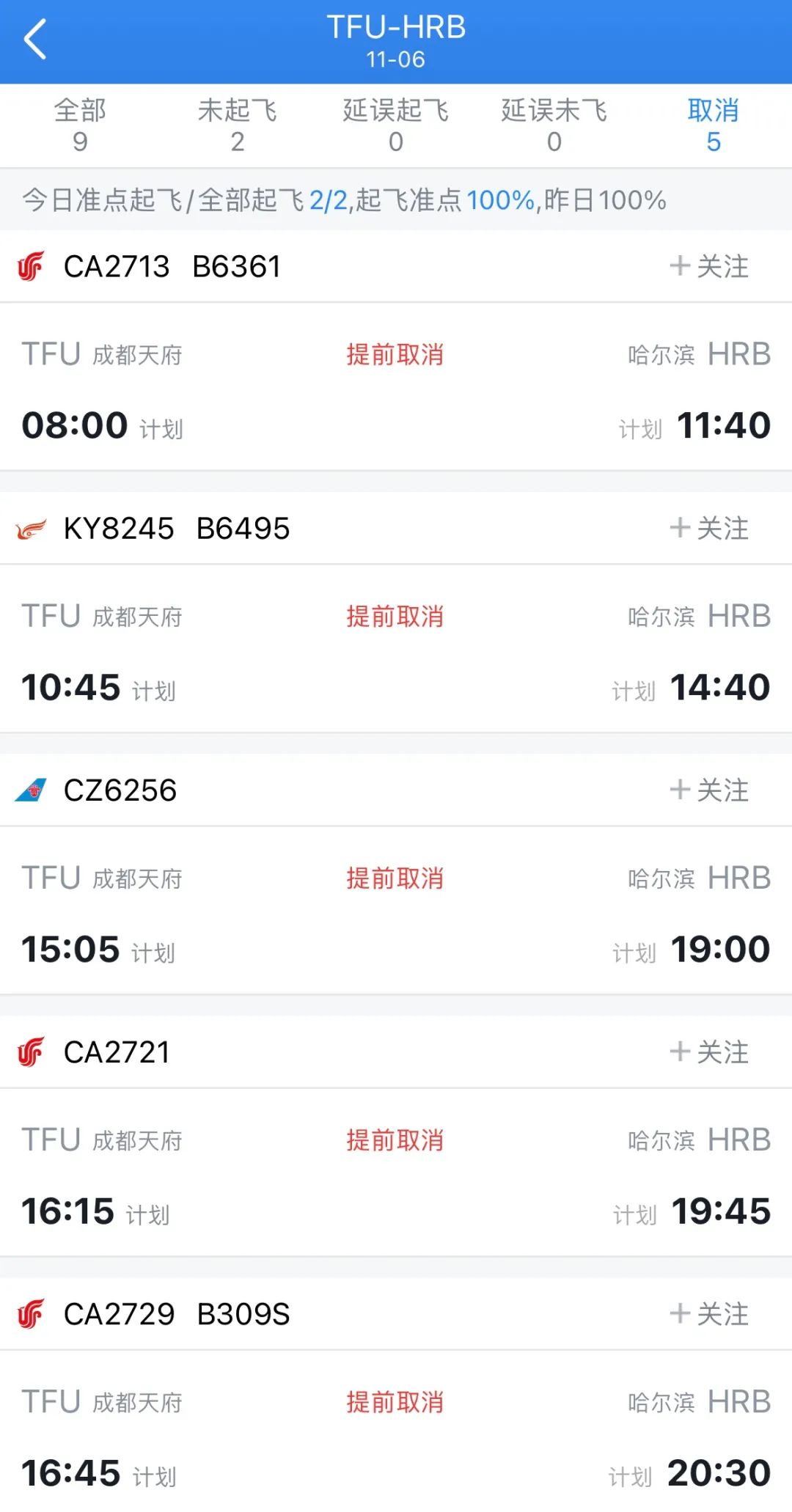 11月6日12时许,记者在飞常准平台看到,截至上午12时,成都天府飞哈尔滨太平机场、沈阳桃仙机场各有5个出港航班已提前取消,成都天府飞长春龙嘉机场有6个出港航班已提前取消,取消原因均为“天气原因”。