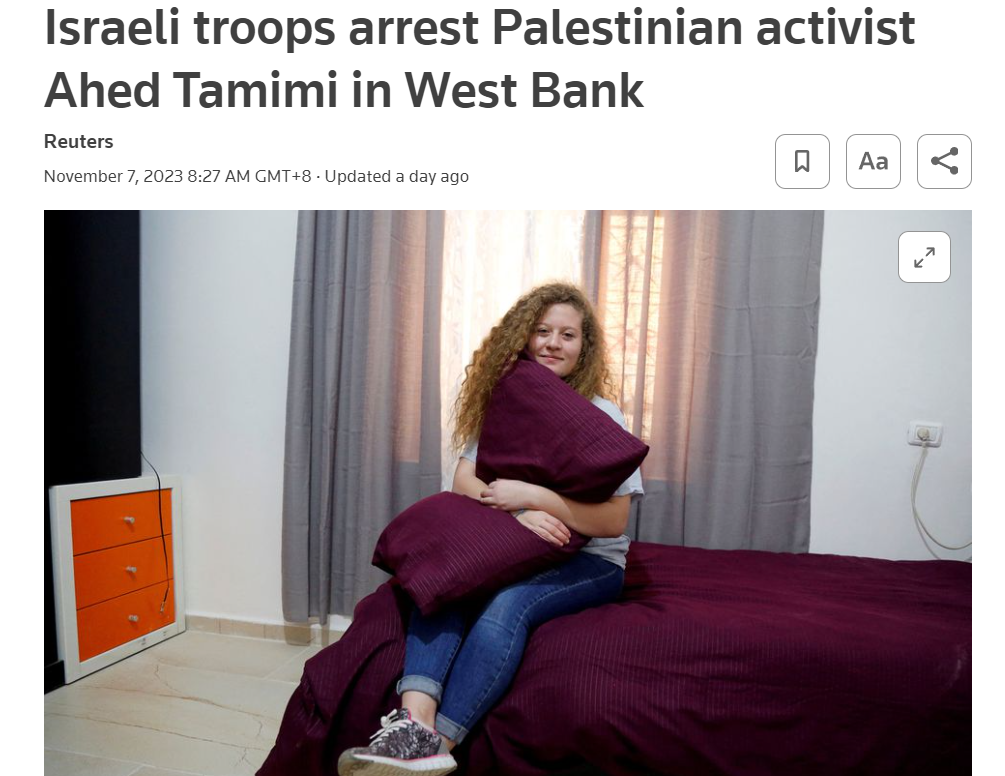 塔米米的母亲纳里曼·塔米米说,十几名以色列士兵在夜间进入他们的房子,逮捕了她的女儿。“以色列当局称,一名年轻女子在Instagram上写了一篇煽动性的帖子,呼吁杀害定居者,并说希特勒对犹太人做得还不够——但阿赫德没有Instagram账户”,塔米米的母亲在接受采访时说。