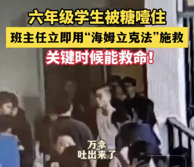 日前,浙江湖州市一所小学的老师发现一名学生在走廊弯腰干呕、无法呼吸,判断其窒息,班主任立即用“海姆立克急救法”施救,将学生卡在喉咙的榴莲糖排出。