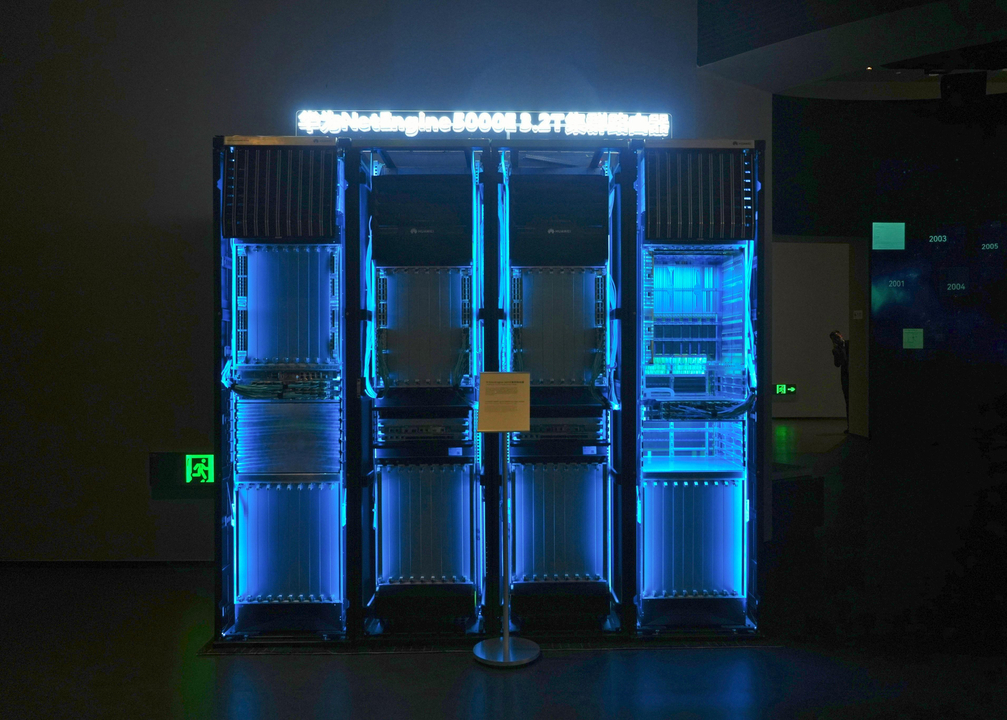 朱建波介绍,这台机器叫NetEngine 5000E 3.2T集群路由器,也是华为特别高端的一台路由器,“它每秒钟可以传输512T的数据。假设一部电影为1G,那么这台路由器能够在每秒传输52.4万部电影,在全球处于领先地位。”