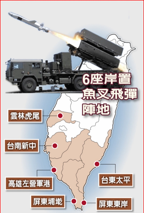至于新设岸基雄风导弹阵地,据《中国时报》了解,台军方将在新北、嘉义、桃园等9个地点,新设相关阵地设施。报道声称,台军方编列797亿元,分两阶段量产各型岸基雄风导弹,再加上岸基鱼叉导弹的866亿元,台军方总计编列1663亿元,在台构建“反舰导弹网”,首要目标就是打击解放军的两栖舰船,阻止解放军登陆。