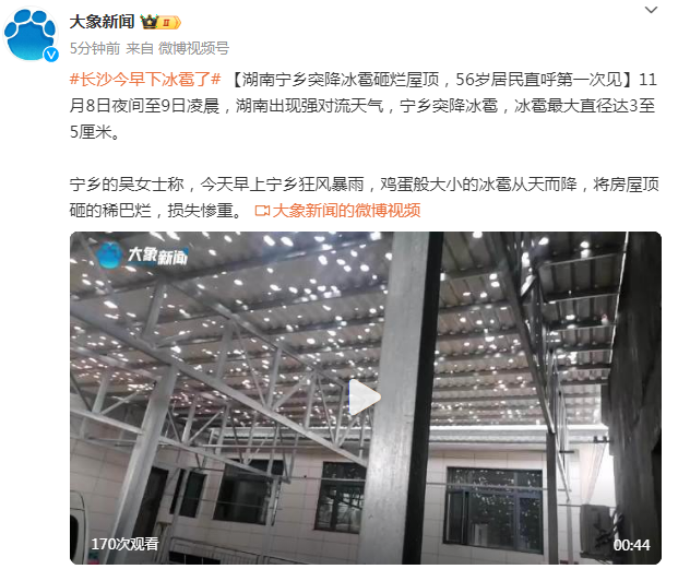 11月8日夜间至9日凌晨,湖南出现强对流天气,宁乡突降冰雹,冰雹最大直径达3至5厘米。