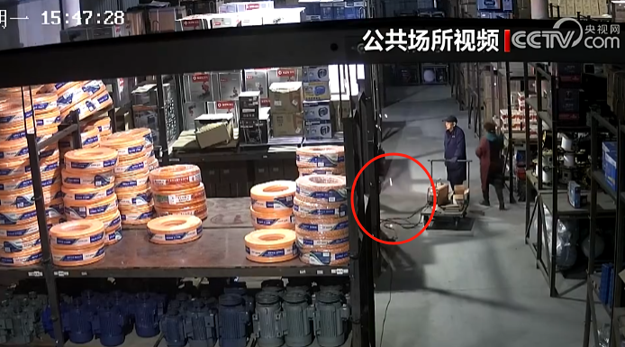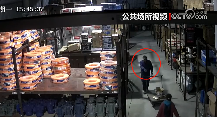 15点45分,一名戴鸭舌帽的老年男子和一名女子进入现场拉接电线,并将电焊设备运送到货架旁。
