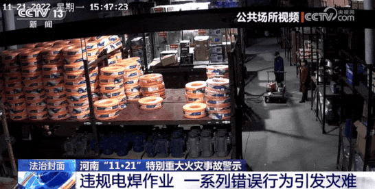 2022年11月21日,河南省安阳凯信达商贸有限公司厂房的火灾就是企业负责人违规操作电焊引发。火灾事故发生后,国务院火灾事故调查组通过调取火灾现场及周边的公共场所视频,询问事故相关人员和火灾亲历者,梳理并还原了起火、成灾经过。