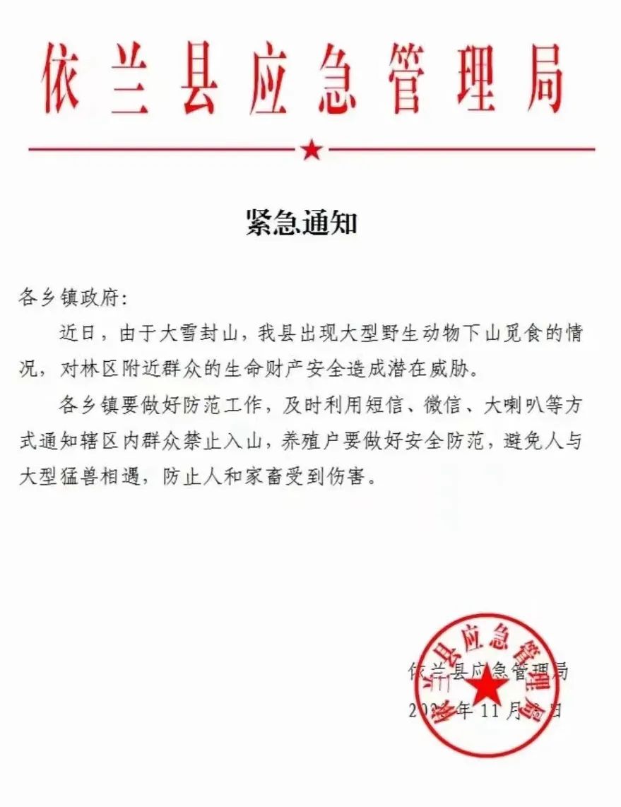 近日,黑龙江省哈尔滨市依兰县发布紧急通知称,由于大雪封山,该县出现大型野生动物下山觅食的情况,对林区附近群众的生命财产安全造成潜在威胁, 请大家做好安全防范,防止人和家畜受到伤害。
