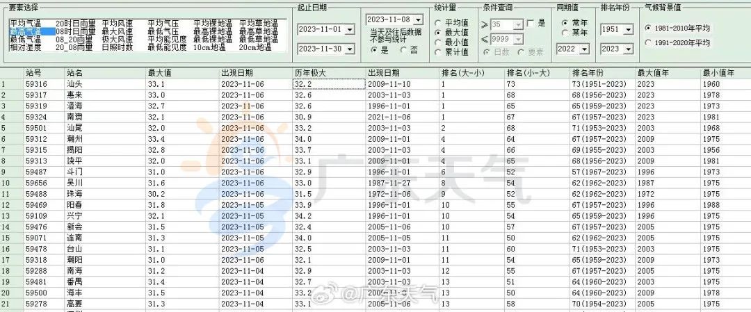 近期的广东热出新天际,11月6日,粤东的汕头、惠来、澄海、南澳最高气温打破11月纪录,汕头33.1℃,惠来33℃,澄海32.7℃,南澳32.1℃。